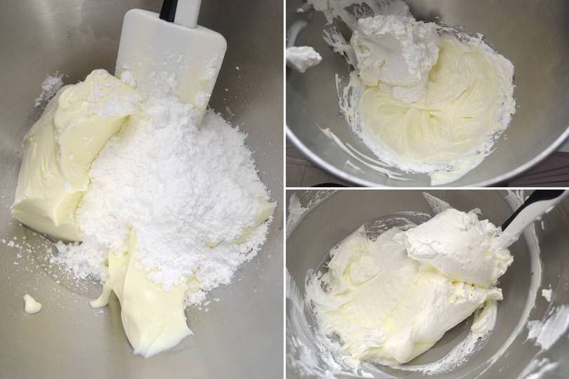 Preparate ora la crema al mascarpone. Lavorate il mascarpone con lo zucchero a velo (i 75 gr), quindi montate la panna ben fredda di frigo e aggiungetela al mascarpone amalgamando con movimenti dal basso verso l'alto.