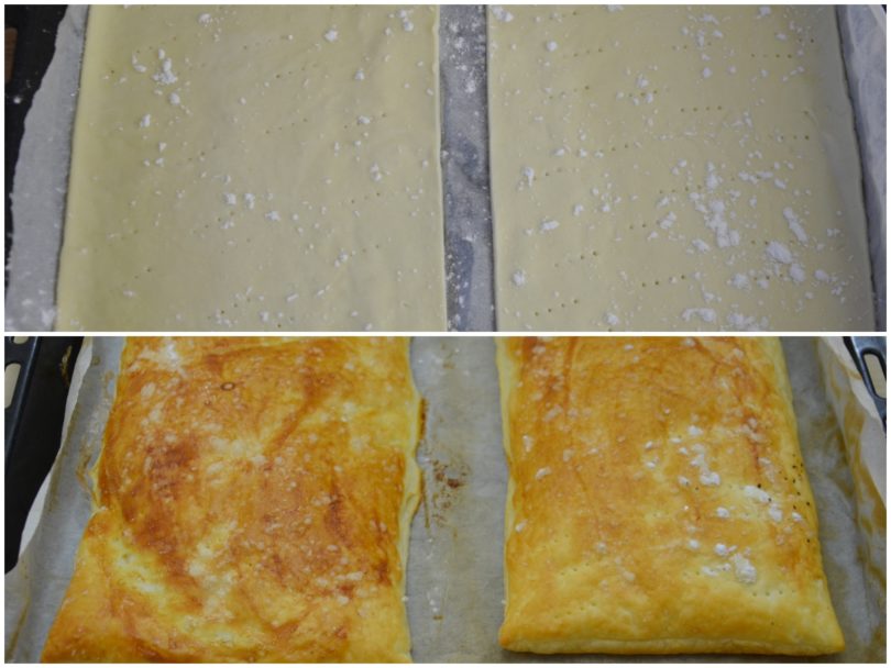 Stendete delicatamente il rotolo di pasta sfoglia e dividetelo a metà ricavandone 2 rettangoli uguali.