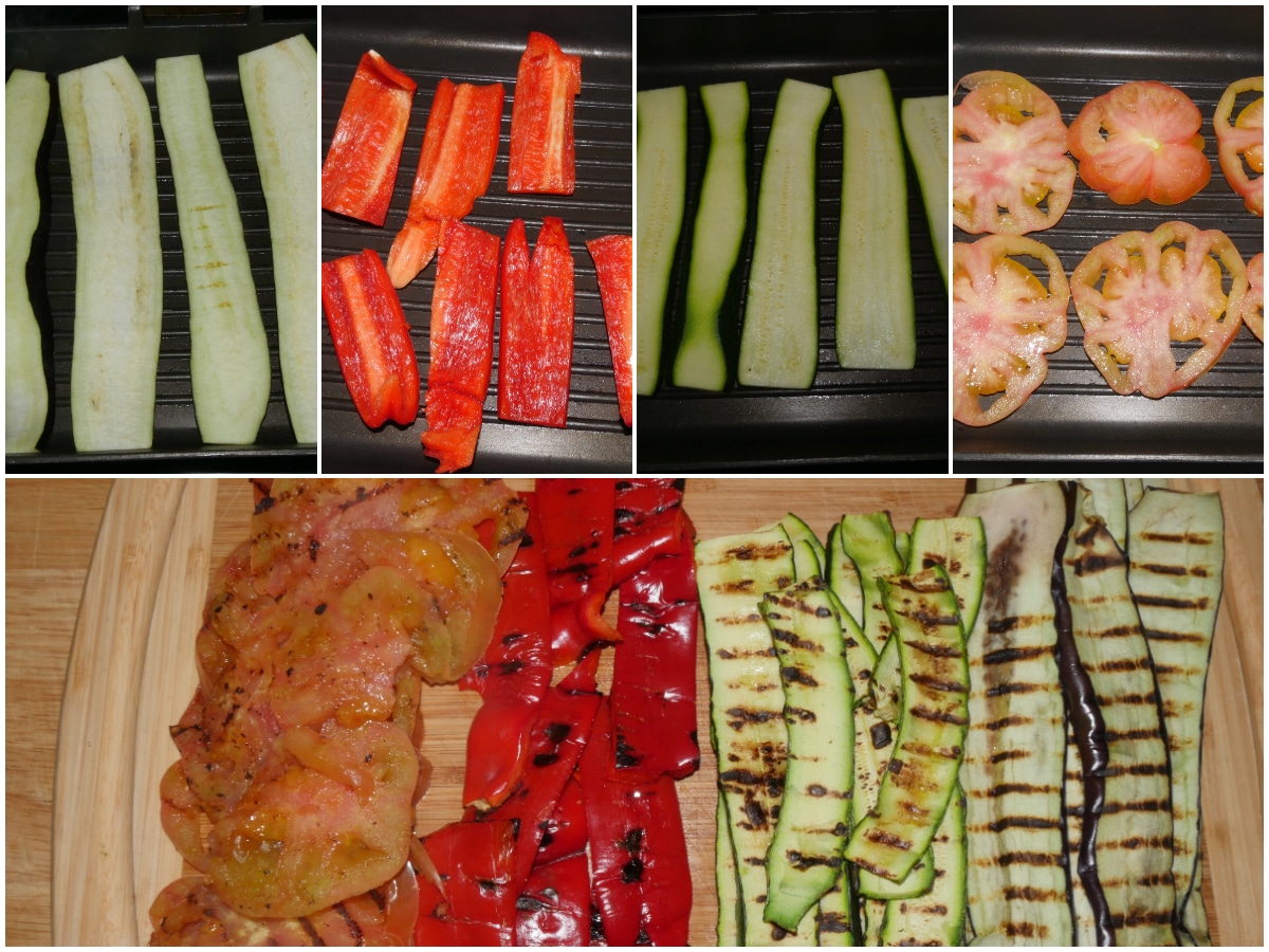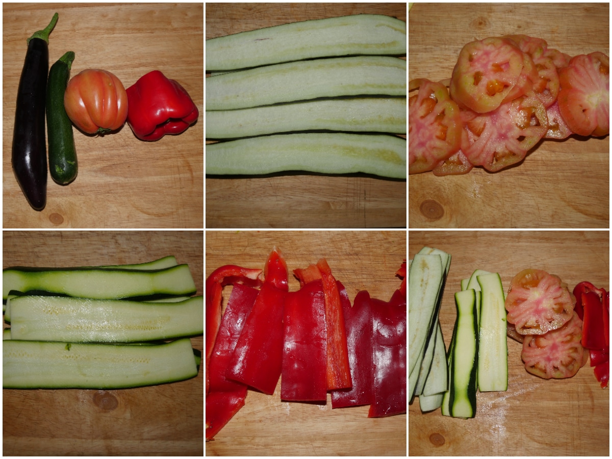 Innanzitutto lavate e mondate le verdure, quindi tagliatele a fette non troppo sottili (circa 1 cm per zucchina e melanzana, anche 1,5 cm per i pomodori, listarelle da 2-3 cm per i peperoni).