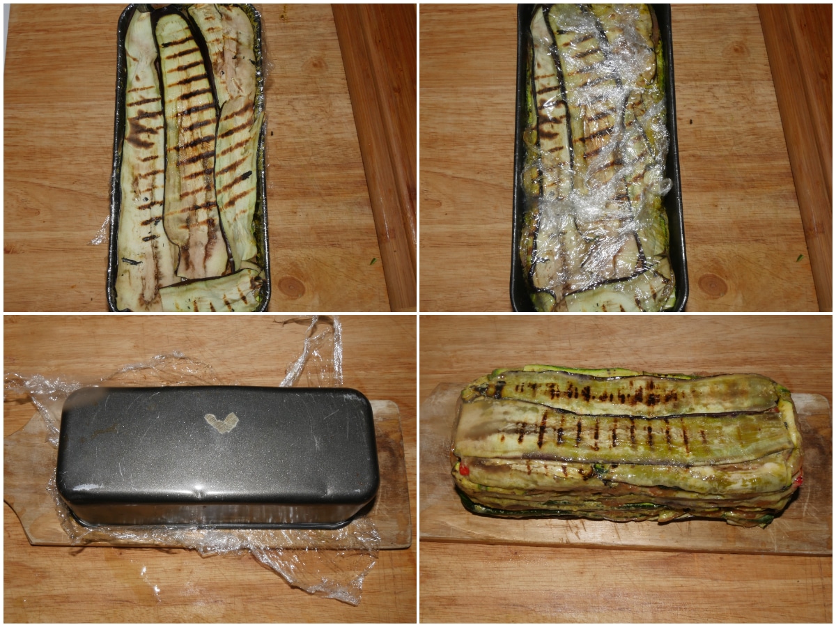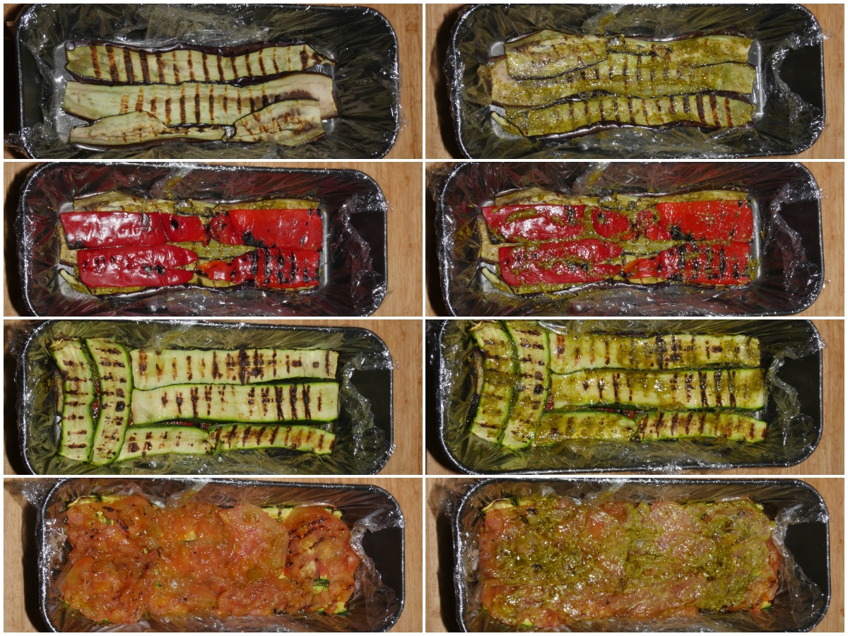 Rivestite lo stampo con della pellicola per alimenti (lasciandola un po' lunga oltre i bordi)e componete la millefoglie: alternando strati di verdure condite con un po' di pesto, finendo con uno strato di verdure senza pesto.