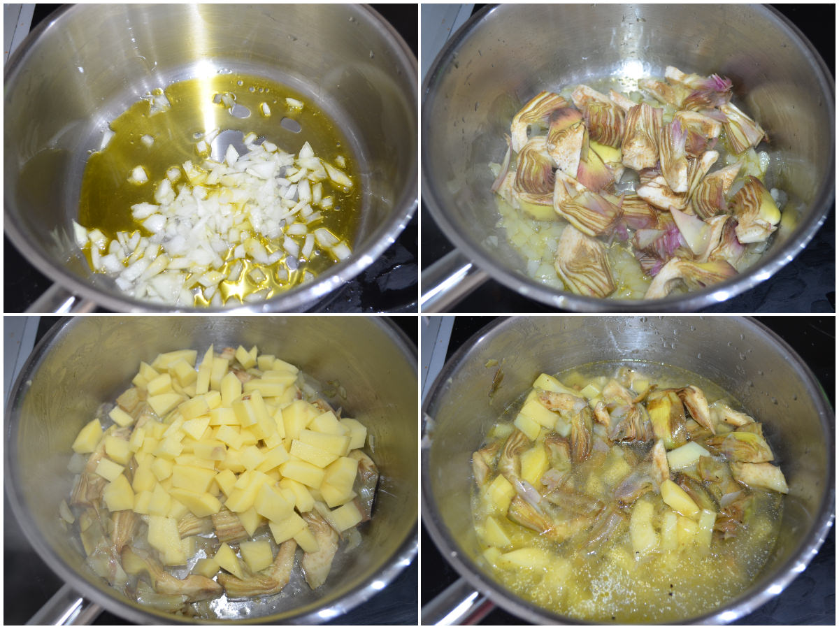 Nel frattempo tritate la cipolla e fatela appassire in una casseruola con l'olio, quindi aggiungete i carciofi ben scolati e fateli insaporire per qualche minuto.