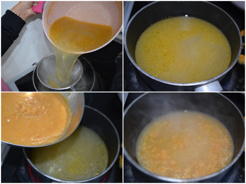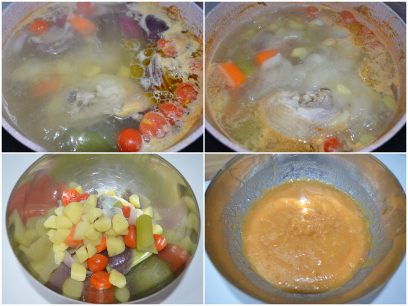 Scolate le cosce di pollo e filtrate il brodo in un pentolino, quindi aggiungete le verdure frullate al brodo e aggiustate di sale.