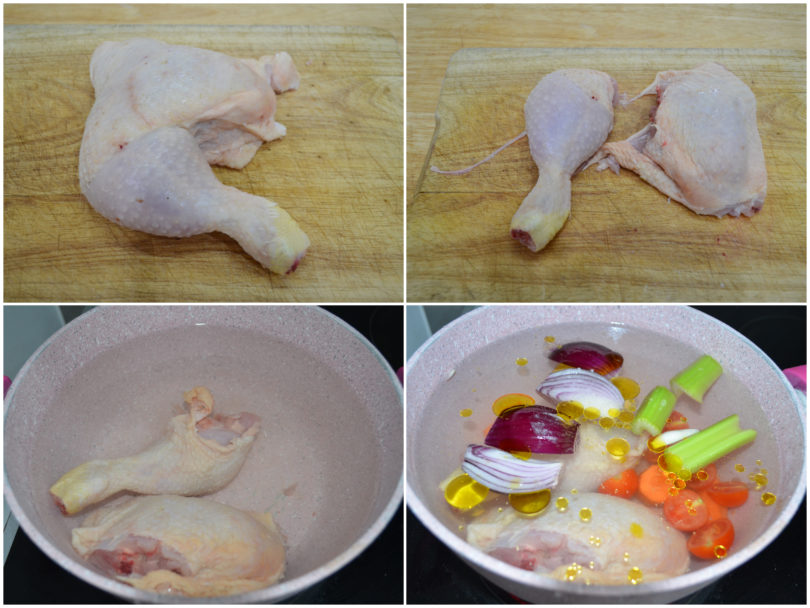 Mettete le cosce di pollo in una pentola, copritele completamente con l'acqua, aggiungete le verdure e un filino d'olio.