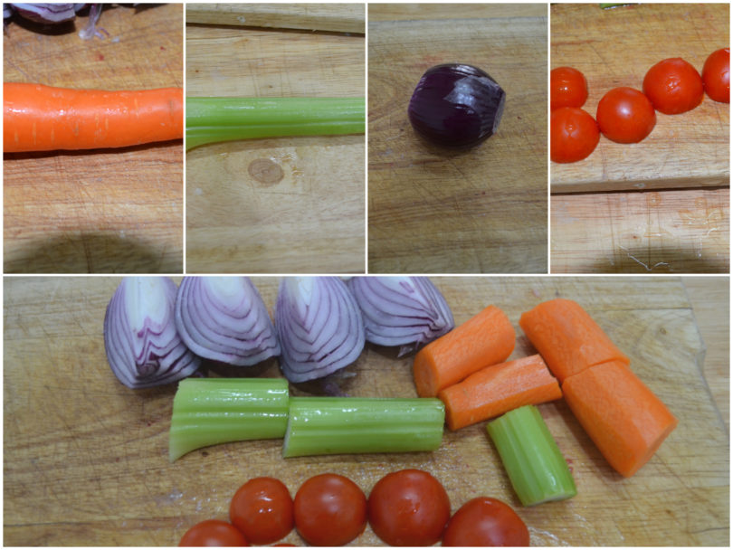 Innanzitutto pulite gli odori e i pomodorini e tagliateli in pezzi.