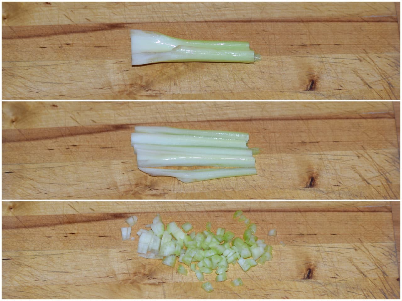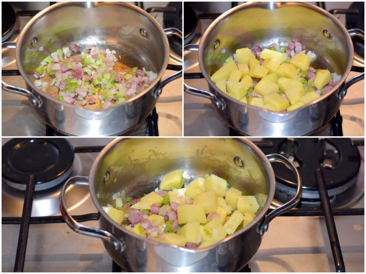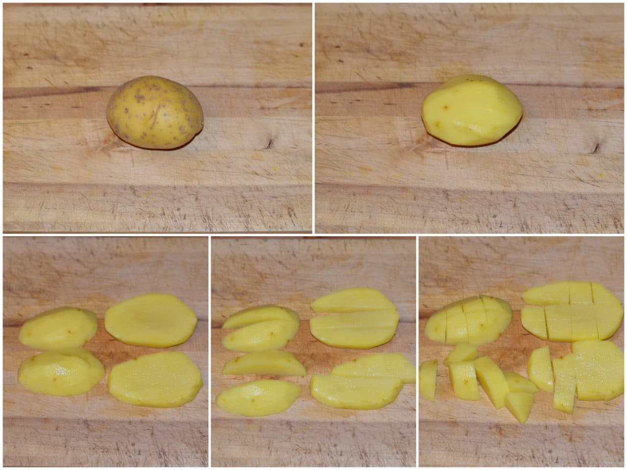 Mondate la patata e tagliatela a cubetti, poi aggiungetela al resto e lasciatela insaporire.
