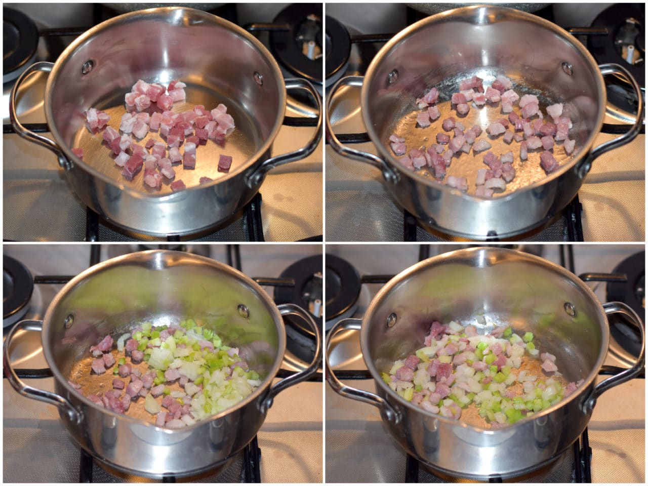 Fate dorare la pancetta in una casseruola dal fondo spesso, quindi unite il trito di verdure e lasciatelo appassire con il grasso sciolto della pancetta (se necessario aggiungete un filo d'olio).