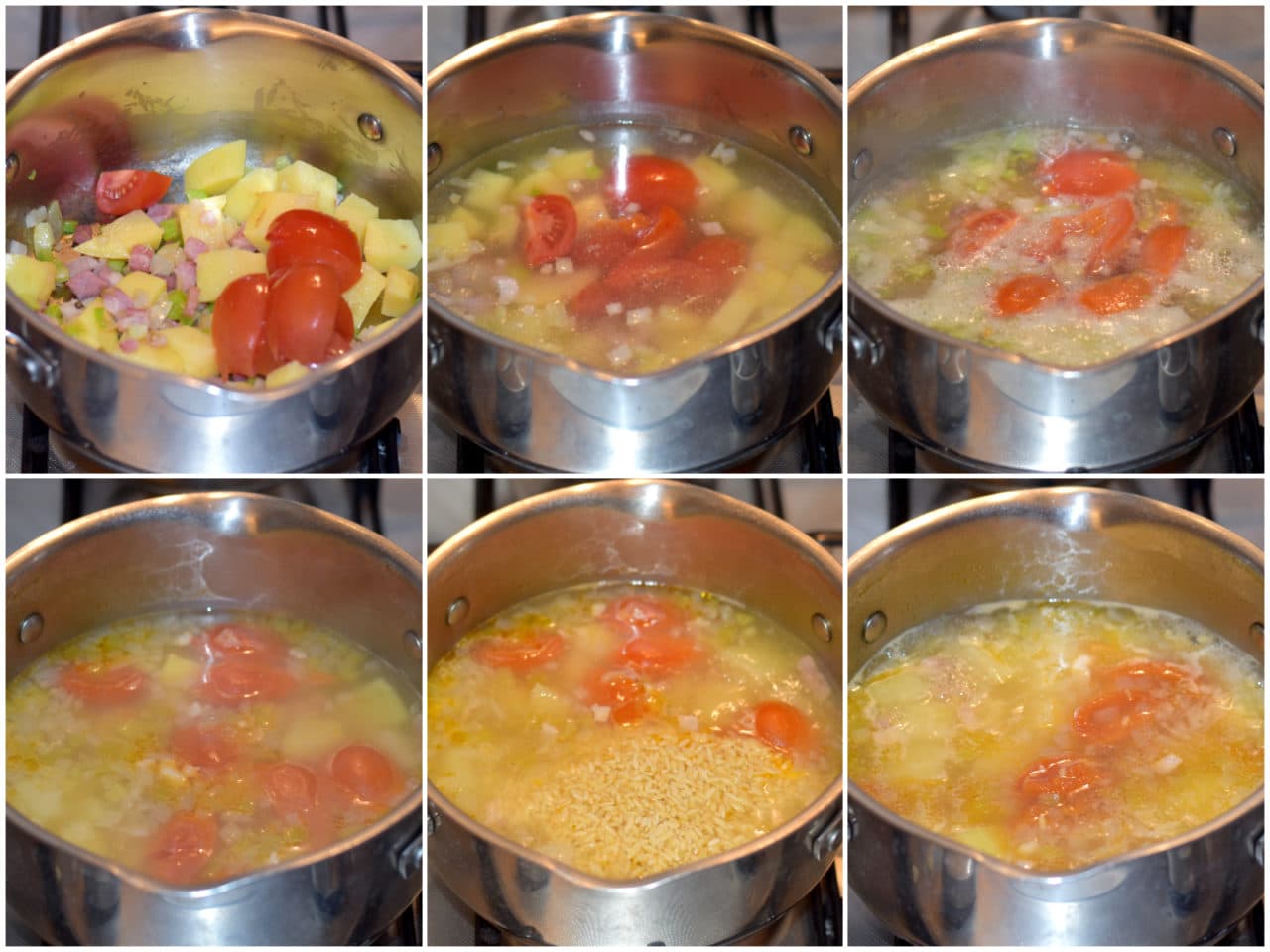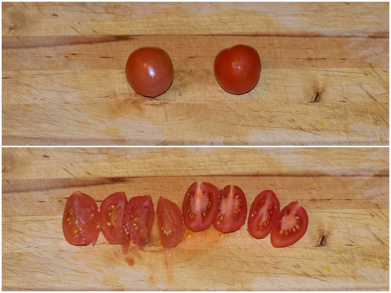 lavate i pomodorini, tagliateli in 4 parti e aggiungeteli, poi salate leggermente, coprite con acqua abbondate, portate a ebollizione e cuocete per circa 15-20 minuti o fin quando le patate non risulteranno cotte.