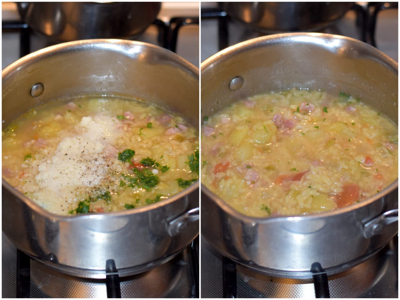 Quando anche la pastina sarà cotta insaporite con pepe, formaggio e prezzemolo e aggiustate di sale se necessario.