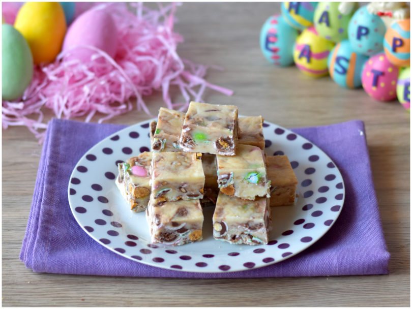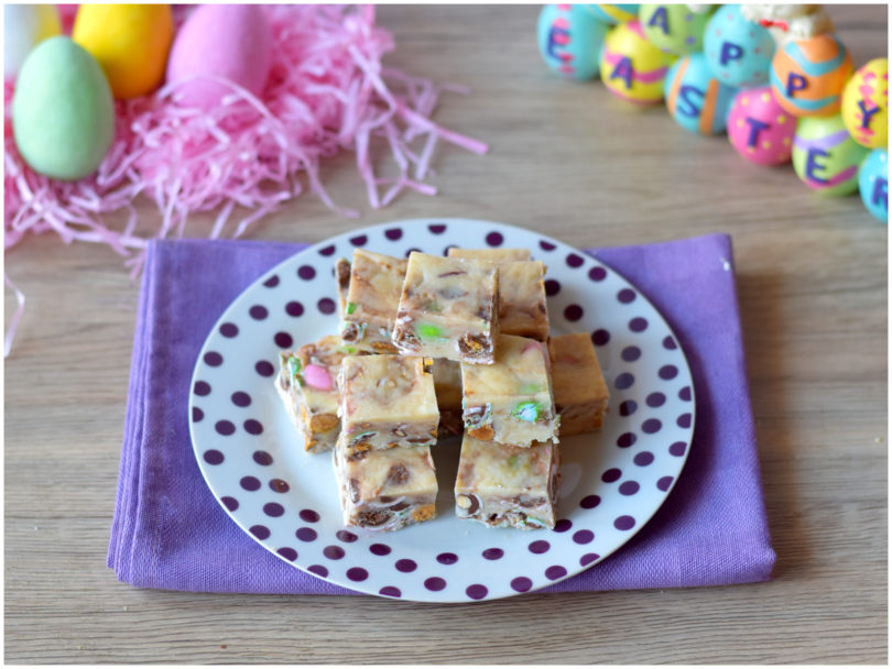 I mini egg fudge sono dei dolcetti golosissimi e super semplici da realizzare, perfetti per festeggiare Pasqua ma anche da preparare come dessert veloce o merenda irresistibile per grandi e piccini. Si tratta di cubetti morbidi e cremosi di cioccolato bianco e latte condensato, arricchiti con deliziose mini uova di cioccolato colorate. Una ricetta a prova di principianti, che si prepara con soli tre ingredienti, ideale da fare anche con i bambini. Se non trovate le uova di cioccolato mini, potete tranquillamente sostituirle con confetti colorati, Smarties o scaglie di cioccolato fondente per una variante ugualmente golosa da fare tutto l'anno!