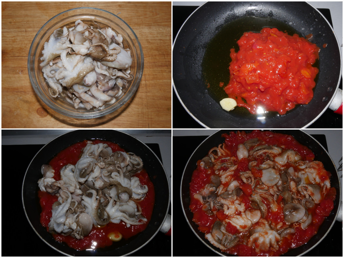 Fate dorare l'aglio con olio abbondante in un tegame, aggiungete il pomodoro e lasciate insaporire, quindi aggiungete i moscardini, eliminate l'aglio e cuocete per circa 20 minuti.