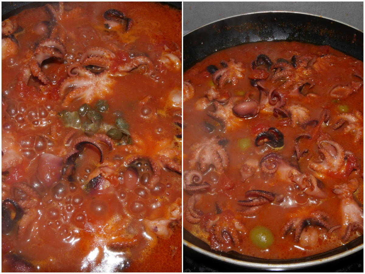 Unite anche olive denocciolate e capperi dissalati e cuocete per circa 20 minuti, quindi aggiustate di sale e pepe.