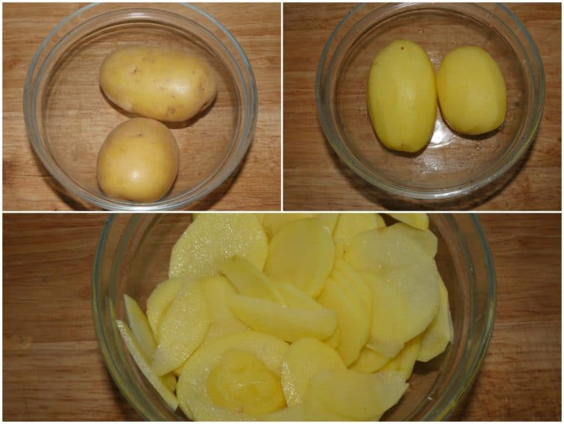 Lavare e sbucciare le patate, tagliarle a fettine di 3 mm e
