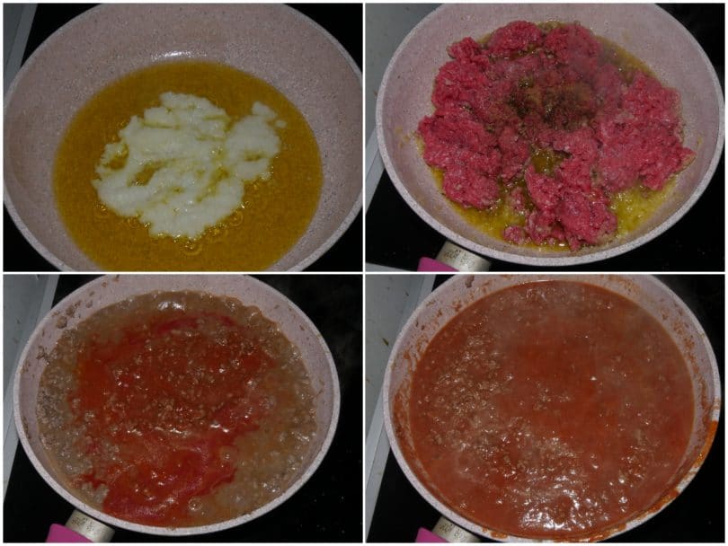 Tagliate la cipolla a velo e fatela imbiondire con olio d’oliva, aggiungere la carne macinata e farla rosolare.Sfumare con il vino, salare, pepare , aggiungere un pizzico di cannella e la passata di pomodoro.