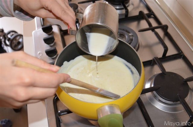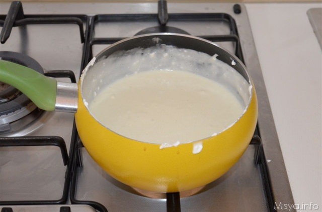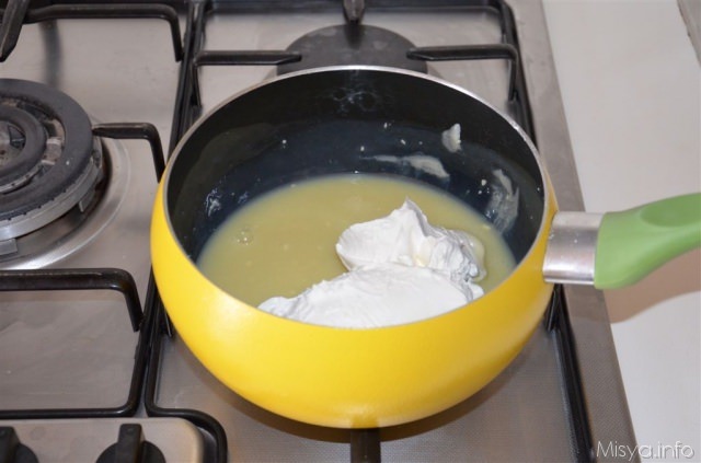 Non appena il cioccolato bianco sarà sciolto, spegnere la fiamma, aggiungere 100 ml di panna liquida calda e mescolare.