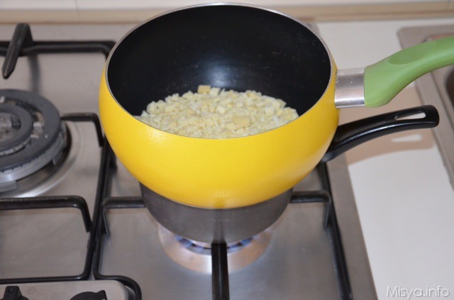 Tritate il cioccolato bianco, metterlo in un pentolino e fatelo sciogliere a bagnomaria