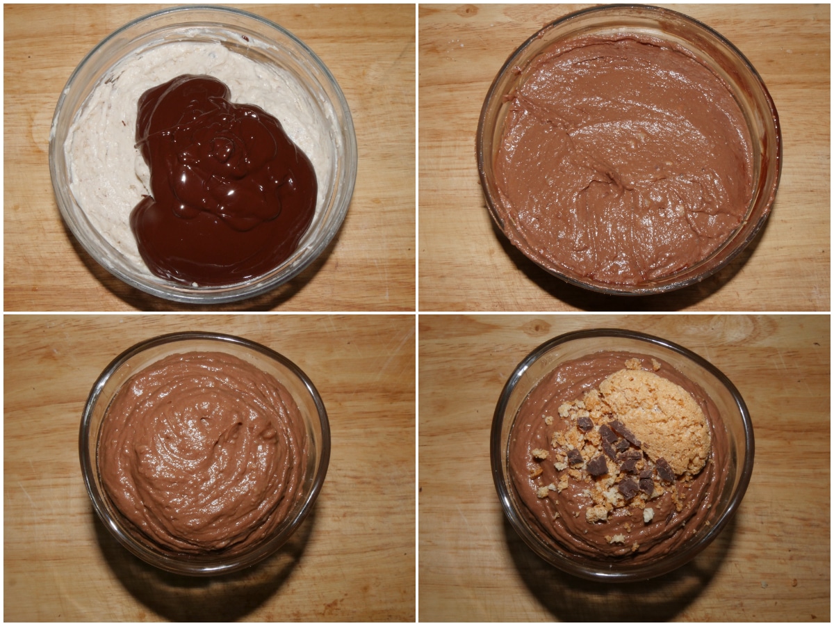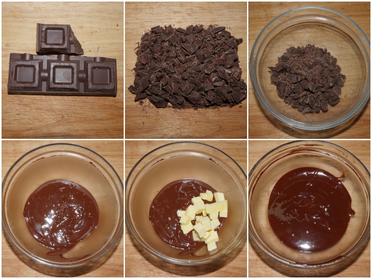 A parte, tritate grossolanamente il cioccolato (in microonde o a bagnomaria), poi mentre è ancora caldo aggiungete il burro a tocchettini e mescolate subito per farlo sciogliere completamente.