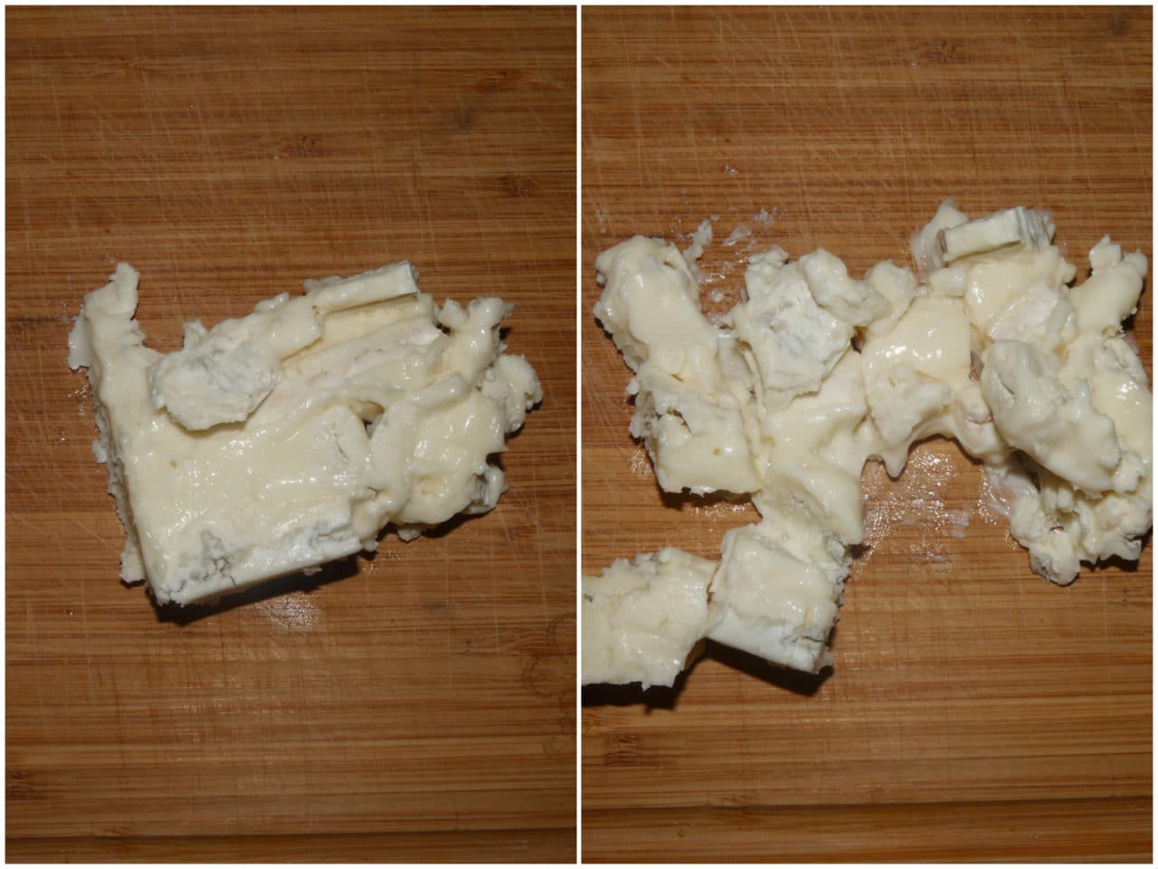Tagli la buccia esterna del gorgonzola, poi tagliatelo in pezzi.