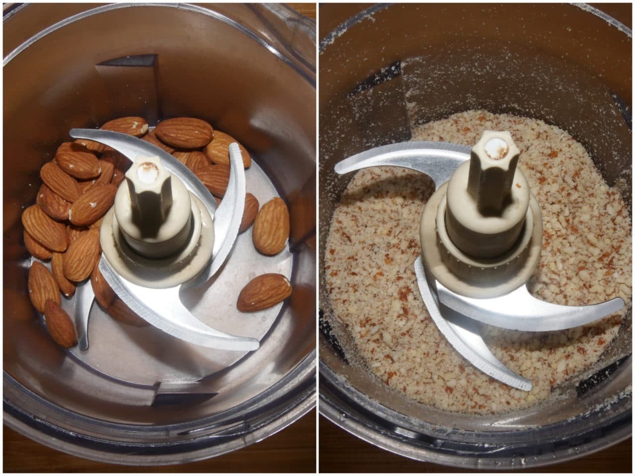Raccogli le mandorle in un mixer da cucina e frullale. Dovrai ottenere una granella fine.