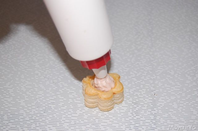 Riempire una sac a poche con la mousse di prosciutto e con essa farcire i voul au vent