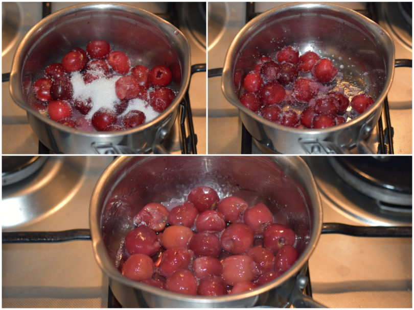 Innanzitutto mettete le ciliegie denocciolate in una casseruola con lo zucchero e l'acqua e lasciate cuocere per 5-10 minuti, finché lo zucchero non si sarà completamente sciolto e le ciliegie non si saranno leggermente ammorbidite, quindi lasciate raffreddare.