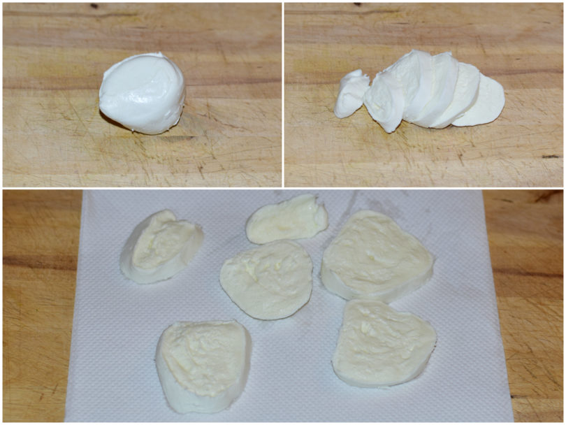 Tagliate la mozzarella a fettine spesse 0,5-1 cm e lasciatela asciugare su carta da cucina.