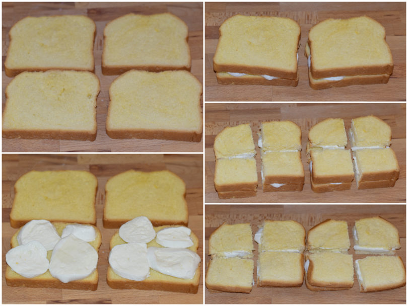 Distribuite la mozzarella su 2 fette di pan bauletto, coprite con altre 2 fette, quindi tagliate ognuno dei 2 sandwich in 4 parti, poi schiacciate leggermente con le mani per assottigliarli e iniziare a sigillarli.