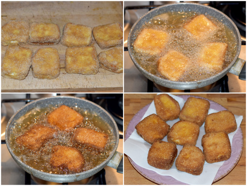Una volta finita l'operazione di panatura fate scaldare olio abbondante in una casseruola e friggete pochi pezzi per volta, capovolgendoli per una doratura uniforme, quindi scolateli su carta da cucina.