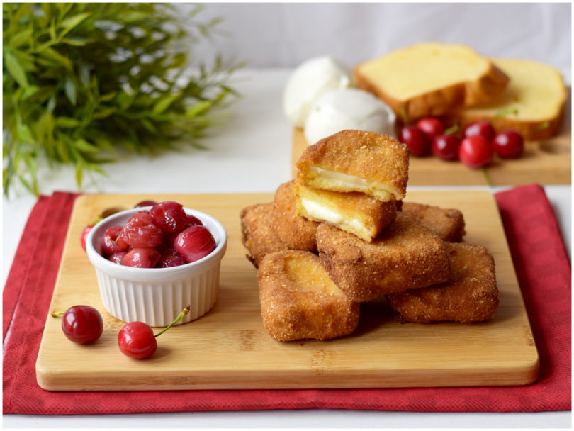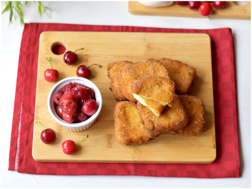 La mozzarella in carrozza dolce è pronta, servitela subito, accompagnandola con le ciliegie caramellate.