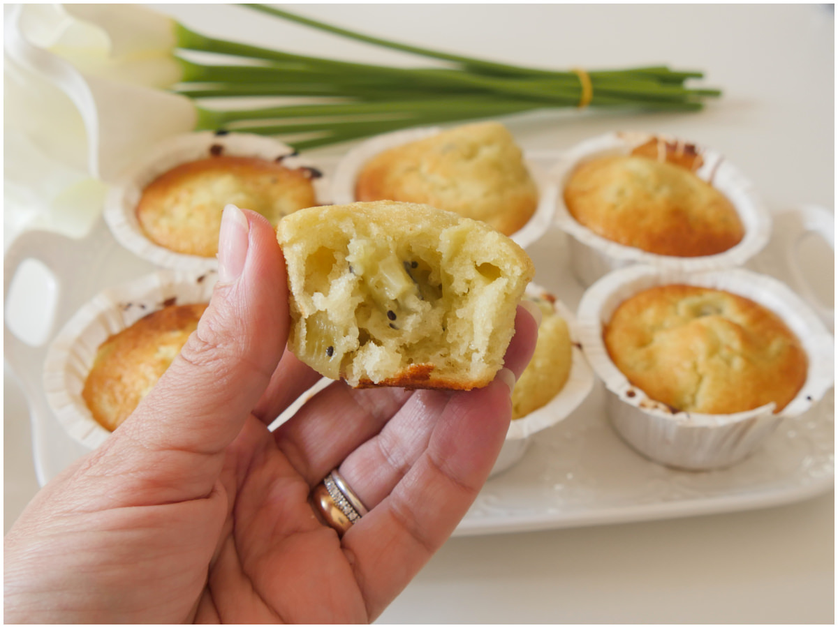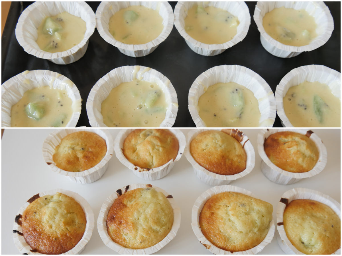 I muffin ai kiwi sono pronti, fateli almeno intiepidire leggermente prima di mangiarli, in modo da non ustionarvi con i kiwi bollenti.
