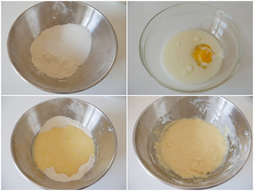 Come sempre per i muffin, unite in una ciotola gli ingredienti secchi (farina, zucchero, lievito, sale) e in un'altra quelli umidi (uovo, latte, olio, vaniglia).