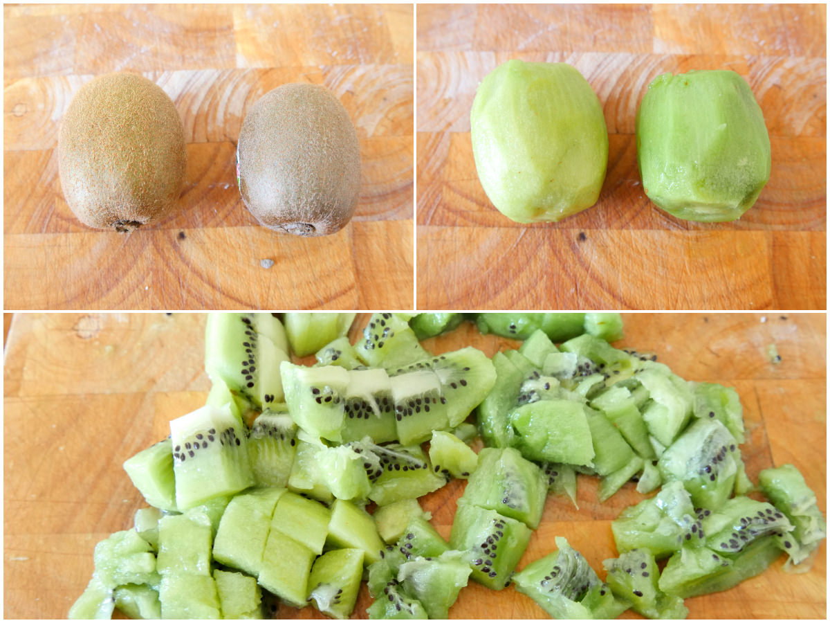 Innanzitutto sbucciate i kiwi e tagliateli a pezzetti.