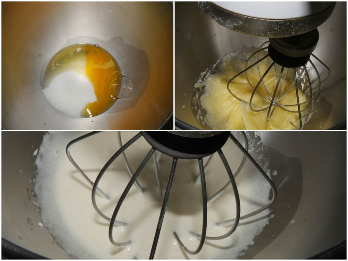 Montate le uova con lo zucchero per almeno 10 minuti, fino ad ottenere un composto molto chiaro e gonfio.
