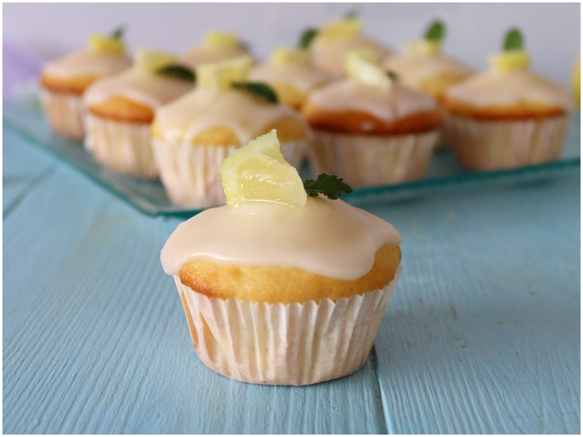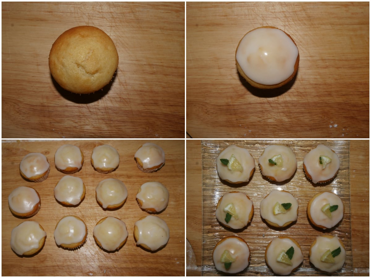Decorate i muffin con un sottile strato di glassa, aggiungendo poi un pezzettino di limone e una fogliolina di menta.