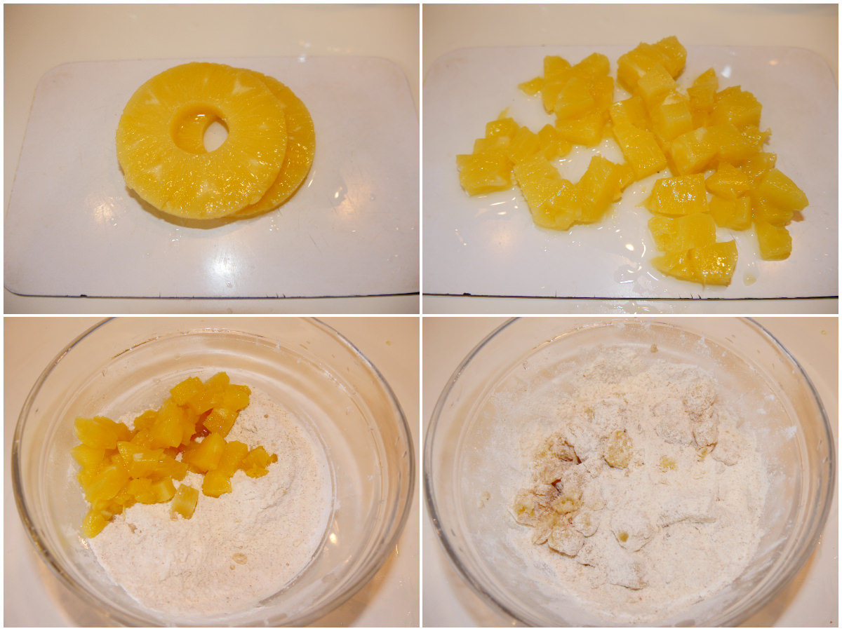 Unite in una seconda ciotola gli ingredienti secchi (farina, zucchero e lievito), quindi aggiungete l'ananas e amalgamate.