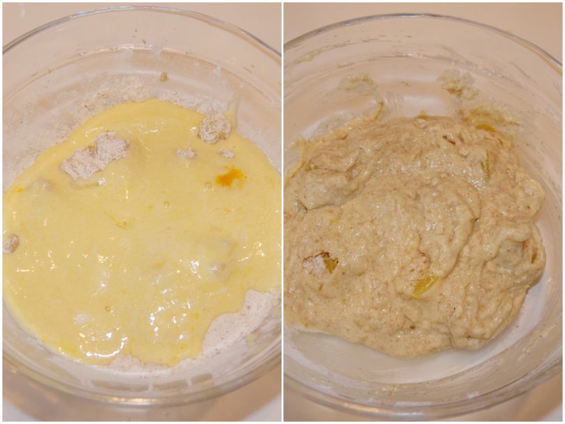 Versate gli ingredienti liquidi sopra a quelli secchi e mescolate bene, fino ad ottenere un composto uniforme.