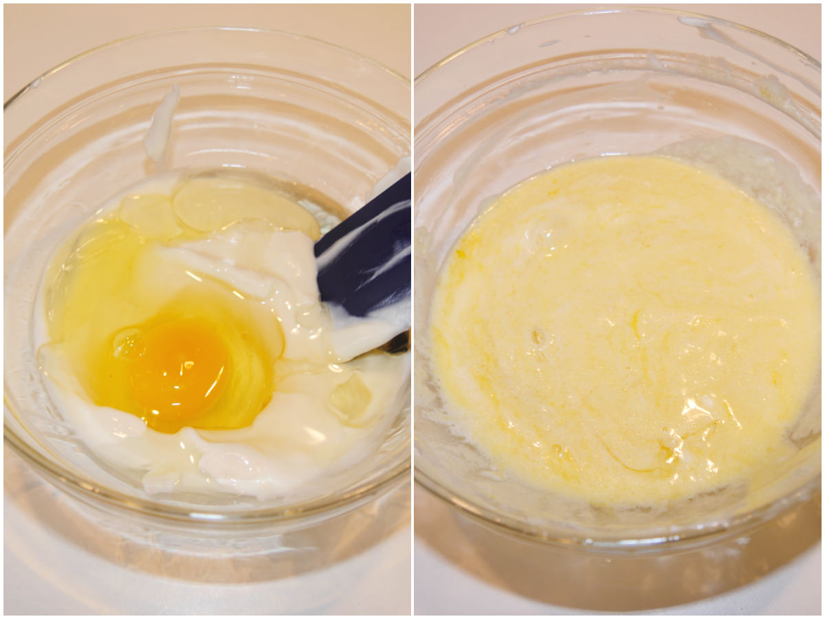 Mescolate in una ciotola tutti gli ingredienti liquidi: uovo, yogurt e olio.
