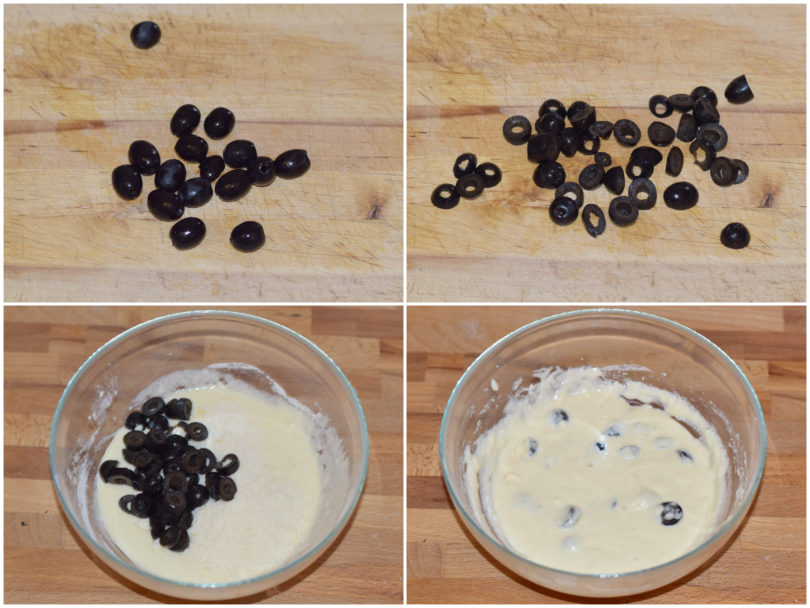Denocciolate le olive, tenetene da parte alcune per la decorazione e tagliate il resto a rondelle, quindi incorporate queste ultime all'impasto.