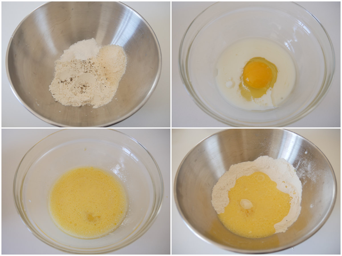Unite gli ingredienti secchi (farina, lievito, sale, pepe, parmigiano) in una ciotola e mescolate.
