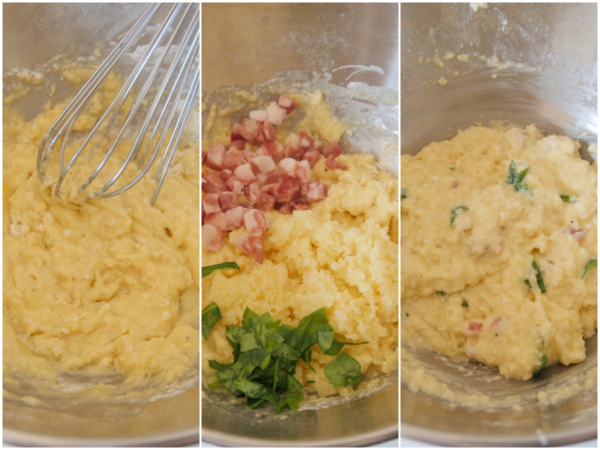 Alla fine aggiungete anche patate, pancetta e basilico spezzettato e mescolate per distribuirli in maniera uniforme.