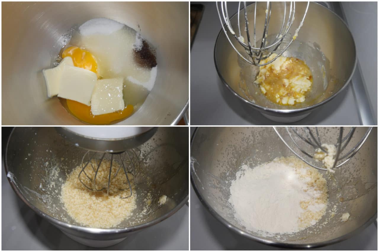 Preparate l'impasto: mettete in una ciotola burro a tocchetti, uovo, zucchero e vaniglia e iniziate ad amalgamare.