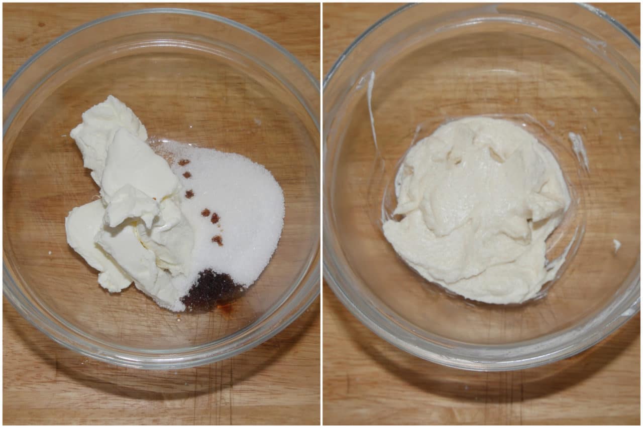 Preparate la farcitura: mettete formaggio, zucchero e vaniglia in una ciotola e amalgamate bene.