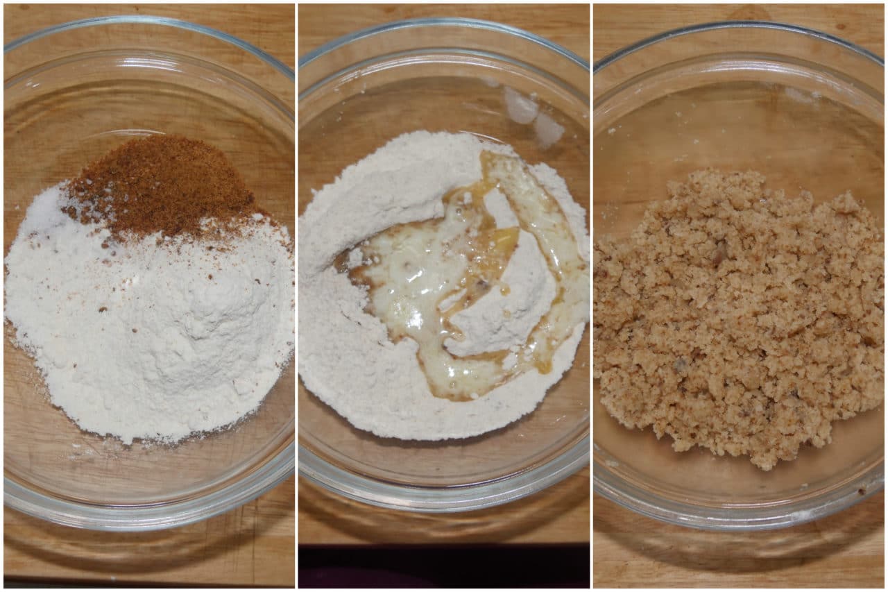 Preparate lo streusel: mettete in una ciotola farina, zucchero di canna e sale e mescolate, quindi incorporate il burro sciolto (a bagnomaria o in microonde) e amalgamate velocemente, fino ad ottenere un composto grumoso.