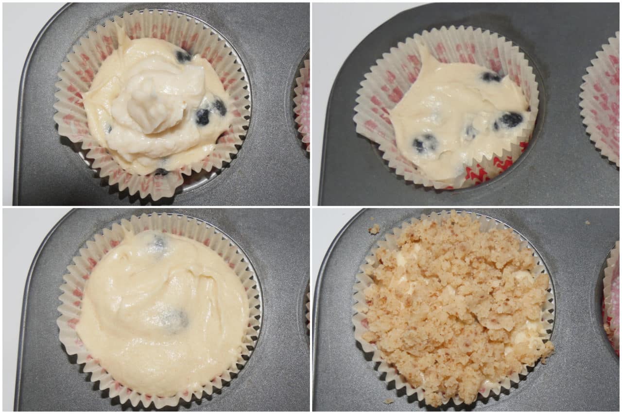 Assemblate i muffin: riempite i pirottini di impasto per 2/3, aggiungete al centro un po' di crema al formaggio, quindi copritela per bene con altra pastella; infine terminate con lo streusel, distribuendolo in maniera uniforme.