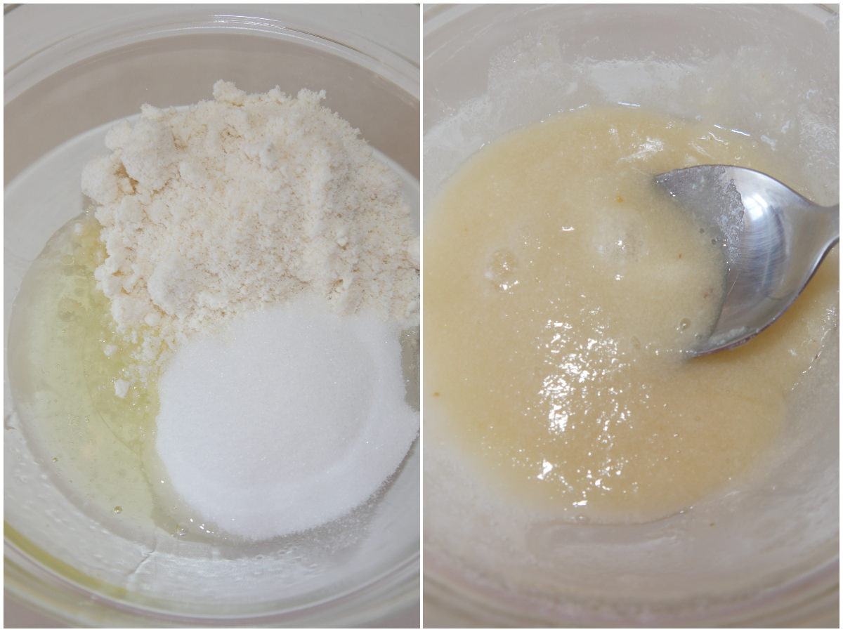 Innanzitutto preparate la glassa: mescolate l'albume con zucchero a velo e farina di mandorle e lasciatela da parte.