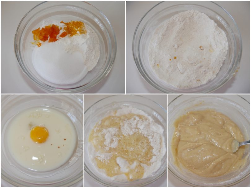 Preparate quindi l'impasto per i muffin, unendo in una ciotola gli ingredienti secchi (farina, zucchero, lievito, canditi, buccia di limone) e in un'altra quelli liquidi (tuorlo, latte, vaniglia, rum), infine versate gli ingredienti liquidi sopra a quelli secchi e mescolate velocemente.