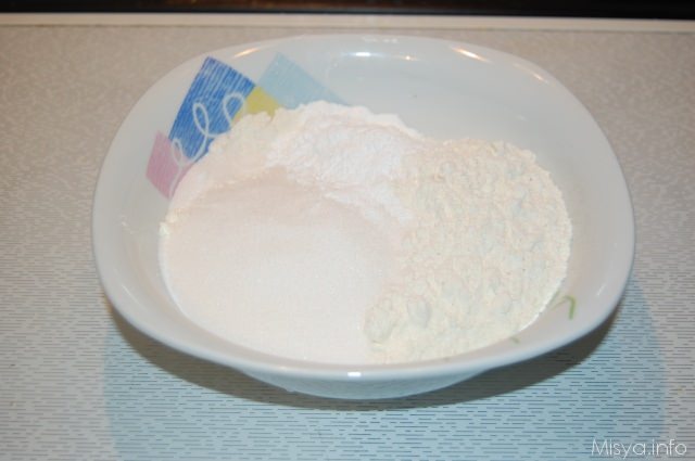 In un'ampia ciotola mescolate la farina, lo zucchero e il lievito.