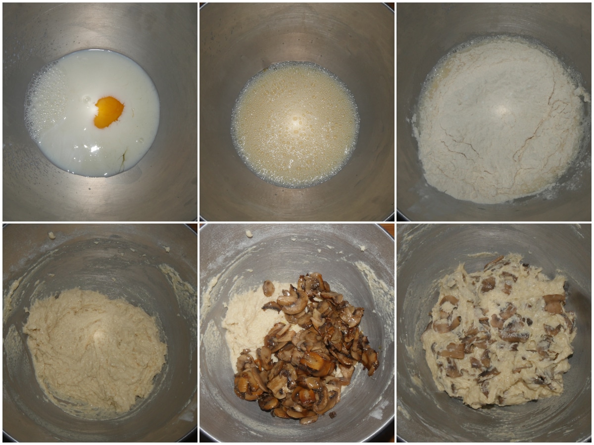 Aggiungere il composto di farina e parmigiano nel battuto di uovo e latte e mescolare il tutto con un cucchiaio di legno.Aggiungere ora all'impasto i funghi e mescolare per farli amalgamare per bene.