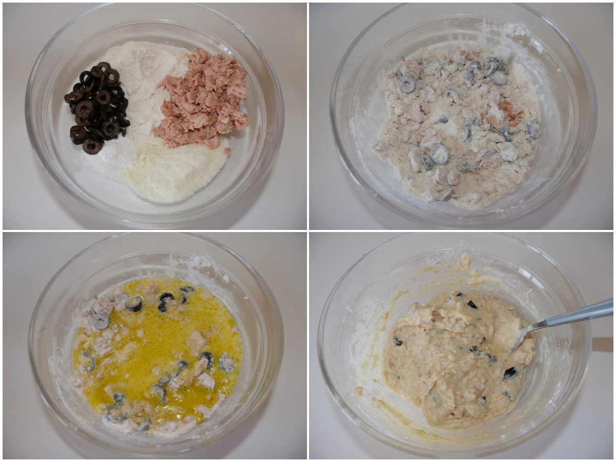 A parte, unite gli ingredienti secchi (farina, sale, lievito, tonno, olive e un pizzico di sale).
