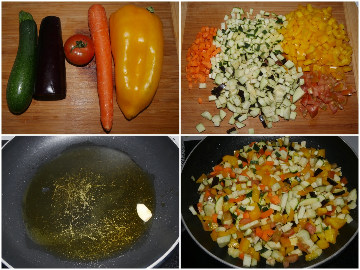 Mondate le verdure e tagliatele a pezzettini e cuocetele in padella con un filo d'olio e uno spicchio d'aglio per una decina di minuti. Una volta cotte, spegnete la fiamma e mettetele da parte.