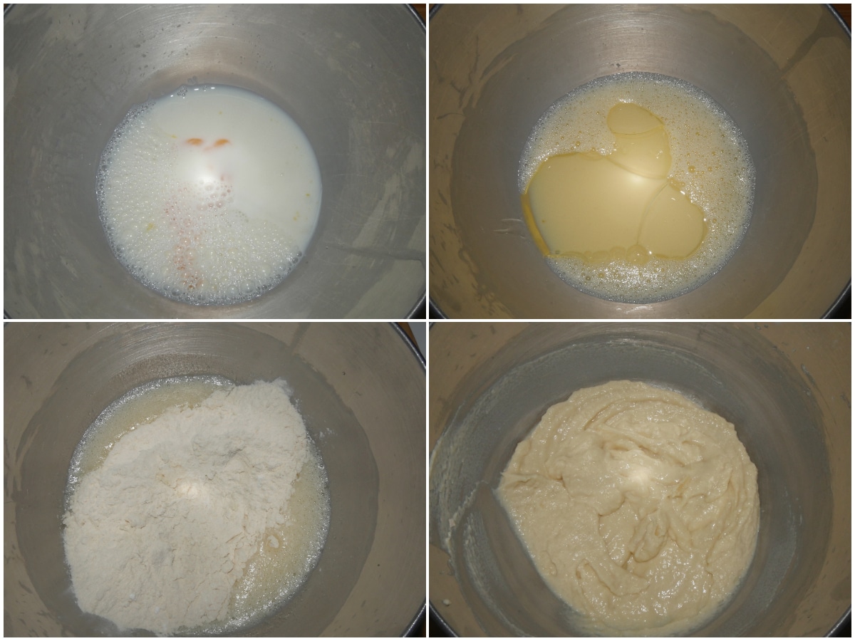In una ciotola mescolare l' uovo, l'olio e il latte, a parte mescolare la farina , la grana grattugiata, il lievito istantaneo, sale e pepe.